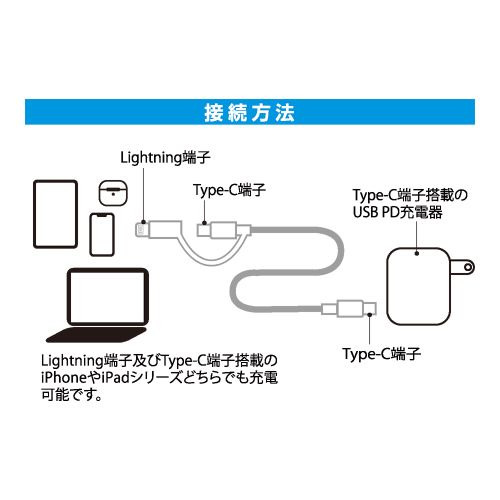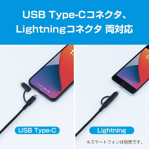 Lightning 端子、USB Type-C 端子を 1 本で使えますので2013 年以降発売のすべての iPhone と iPad に対応できます。複数の機器を持っている方や、なるべくケーブルを減らしたい方にもおすすめできます。