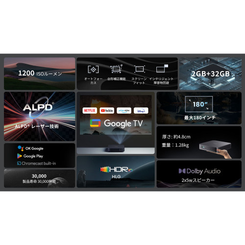 スポーツ鑑賞/Google TV搭載/公式Netflix認証/Youtube、PrimeVideoプリインストール/ミニ レーザープロジェクター / DLP搭載 / 1200 ISO ルーメン / Dolby Audio採用 / 障害物回避 / 自動アジャスト / 180インチ対応 / 5Wスピーカーを2基内蔵 / オートフォーカス / 自動台形補正 / HDR10対応 / アイプロテクション機能 / 静音 / Bluetooth対応 / ホームシアター