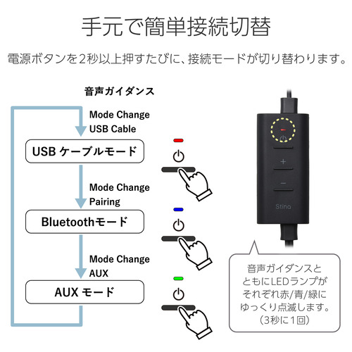 ●4種類の接続方法は、コントローラーのボタンを長押しするだけで切り替えることができ、コントローラーのLEDで現在の接続モードを確認可能です。