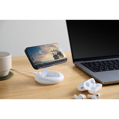 ●マグネットで固定するだけでQi2対応スマートフォンを高速充電できる、Qi2規格ワイヤレス充電スタンドです。最大出力15WでiPhoneを充電できます。