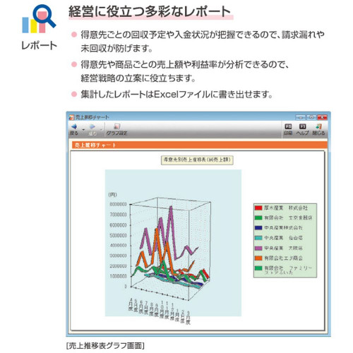 納品書、請求書等の各種帳票印刷と売上管理、分析まで対応した販売管理ソフト。2人に1人が選ぶ、売上実績No.1の業務ソフト。