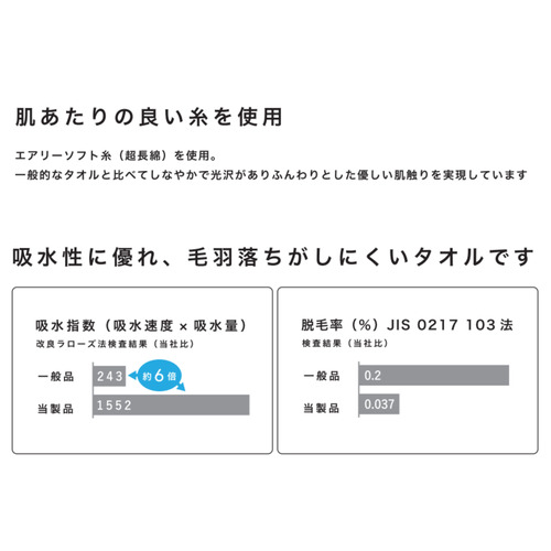 エアリーソフト糸(超長綿)を使用しているので、一般的なタオルと比べてしなやかで光沢がありふんわりとした優しい肌さわりを実現しています。吸水性にも優れていて、毛羽立ちがしにくいタオルです。