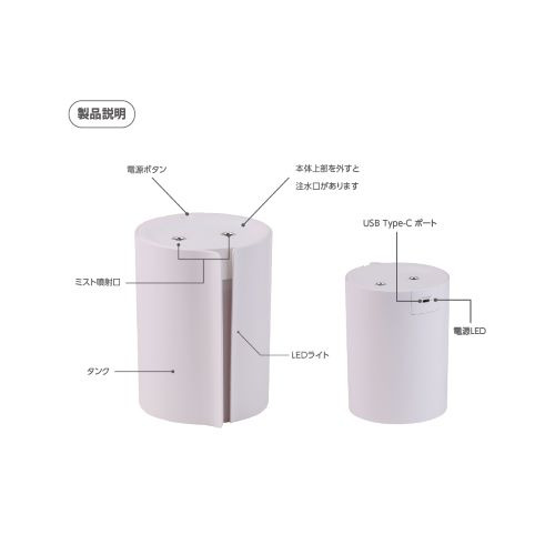 シンプルな2口噴射タイプのUSBポータブル加湿器で、静音設計とLEDライト機能を備えています