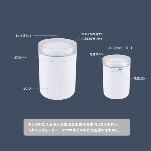シングルミストの卓上加湿器でコンパクトでありながらしっかり潤う。※タンク内に入れる水は常温の水道水を使用してください。ミネラルウォーター、アロマオイルなどは使用できません