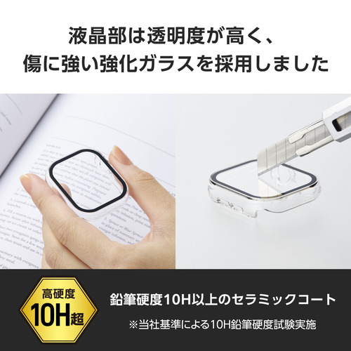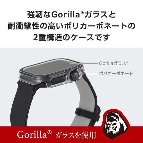 ●鉛筆硬度10H以上のセラミックコートを施したGorilla(R)ガラスと耐衝撃性の高いポリカーボネート素材の2重構造で、Apple Watchの画面および側面部を保護します。