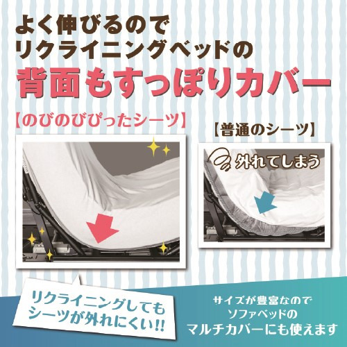 伸縮生地がリクライニングの動きにぴったりフィット。さらに様々な厚さや長さのマットレスにもフィットします。やさひい肌触りのニット生地はシワになりにくく、アイロン不要でお手入れも簡単。