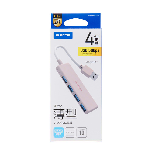 ●USB-Aポートを増やしてデスクまわりをすっきり。4つのUSB-Aポートを搭載した、USB-A接続のUSBハブです。USB 5Gbps(USB3.2(Gen1))で高速データ転送が可能です。機能を絞った薄型設計で、持ち運びにも便利です。