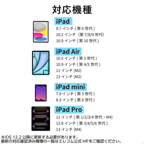 対応機種:2018年以降の全てのiPadに対応 ※2024年11月現在 ※iOS 12.2以降に更新する必要があります。対応確認済み機種の一覧は//www.elecom.co.jp/r/s666をご覧ください