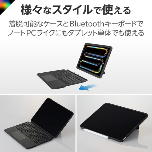 ●キーボード・スタンド・ケースと1台でさまざまな使い方が可能。コンパクトながら高い操作性を実現する、11インチiPad Pro(M4)専用 ケース一体型キーボードです。