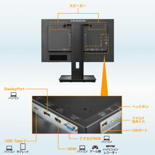 ●USB Type-C搭載のパソコンなら、ケーブル1本で映像出力もノートPCへの給電も可能ですので、スッキリとした作業環境が実現できます。さらに、広視野角パネルを採用しているため、画面の向きや角度を動かしても映像を変わらず鮮明に映し出します。豊富な接続端子も搭載しているので、仕事にもプライベートにも最適です。