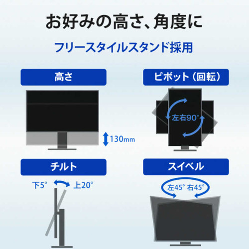 ●3辺フレームレスパネルを採用スッキリスタイリッシュなフレームレスパネルを採用パネルとフレーム(枠)による段差がないフラットなフレームレスパネルを採用しました。約2.5mmの極細フレームですっきりした印象を与え、マルチディスプレイにもオススメです。スタイリッシュなデザインの液晶ディスプレイは、自室にもマッチします。