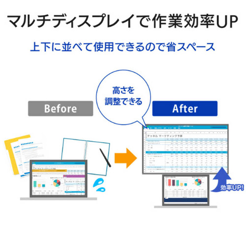「フリースタイルスタンド」を採用!見やすい位置に高さや角度を調整することで、目や肩の疲れやストレートネック対策の一つとしても効果的です。・マルチディスプレイで作業効率UPパソコンにディスプレイをプラスして作業スペースを拡張すれば、2画面で並行して作業が進められるので効率がアップします。本商品は高さも調整できるので、ディスプレイとパソコンを上下に並べて使用できるので省スペースです。・スマホスタンド&ケーブルホルダー付き台座ケーブルをスッキリとまとめられるケーブルホルダー付きの台座を採用。さらに、スマホやキーボードなどを立てかけられるスタンドを前面に配置しました。シンプルなデザインながらもこだわりが詰まっています。