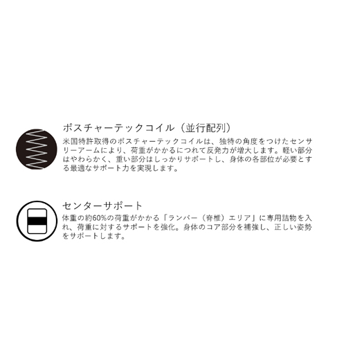 米国特許取得のポスチャーテックコイルは、独特の角度をつけたセンサリーアームにより、荷重がかかるにつれて反発力が増大します。軽い部分はやわらかく、重い部分はしっかりサポートし、身体の各部位が必要とする最適なサポート力を実現します。