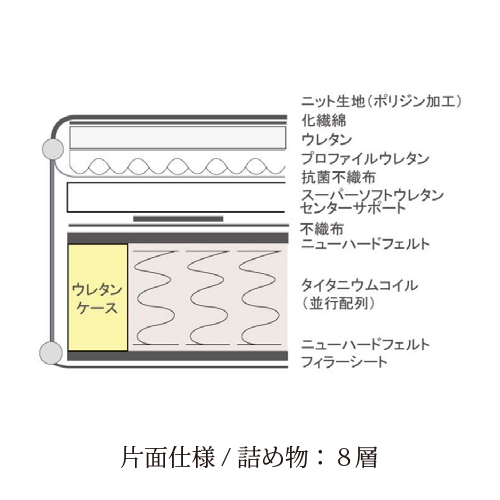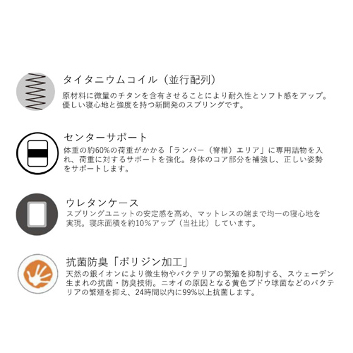 原材料に微量のチタンを含有させることにより耐久性とソフト感をアップ。優しい寝心地と強度を持つ新開発のスプリングです。