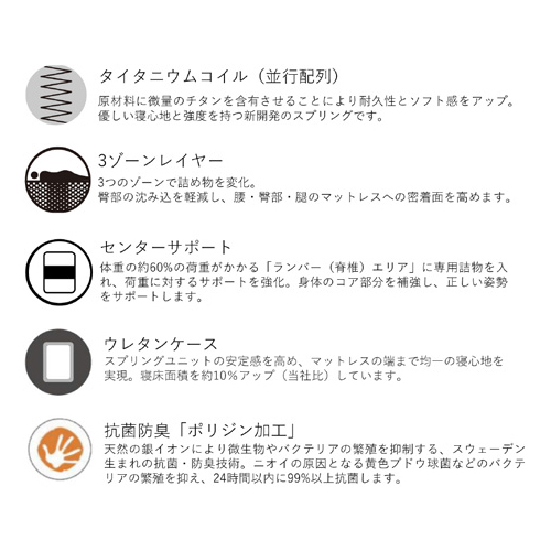 原材料に微量のチタンを含有させることにより耐久性とソフト感をアップ。優しい寝心地と強度を持つ新開発のスプリングです。