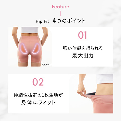 ●Hip FitはSIXPAD Powersuitシリーズ史上最大のEMS出力(最大66V)で、ヒップのなかでも特に大きな大臀筋に集中アプローチ。