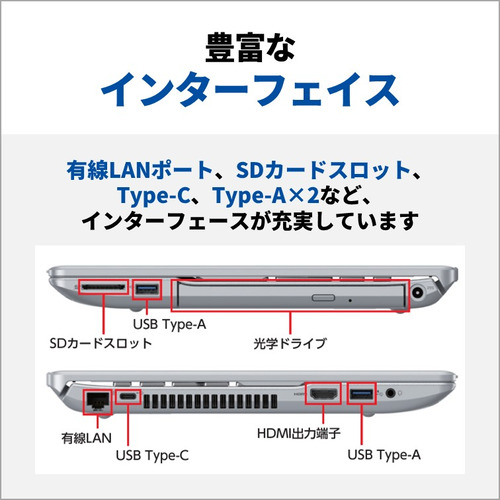 メインパソコンにふわしい、有線LANポートやUSBポートなどの充実のインターフェースを装備。もちろん光学ドライブも搭載しているのでDVDでのデータの保存や視聴も可能です。