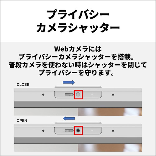 物理的にWebカメラのレンズを隠せる、プライバシーカメラシャッター搭載。動画やWeb視聴時、パソコンを使わない時には閉じておけば安心です。