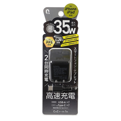クオリティトラストジャパン QTC026BK PD35W対応 Type-C 1ポート USB1ポート ACアダプタ+CTOCケーブル 1m ブラック