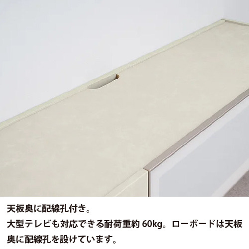 大型テレビも対応できる耐荷重約60kg。天板奥に配線孔を設けているので、コード類をすっきり収納できます。