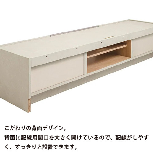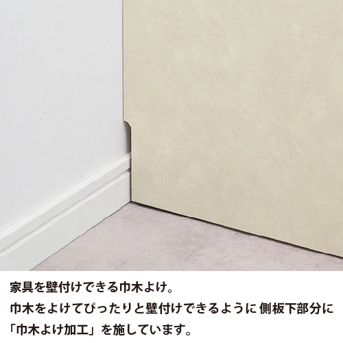 背面に配線用間口を大きく開けているので、配線がしやすく、すっきりと設置できます。また、巾木をよけてぴったりと壁付けできるように側板下部分に「巾木よけ加工」を施しています。