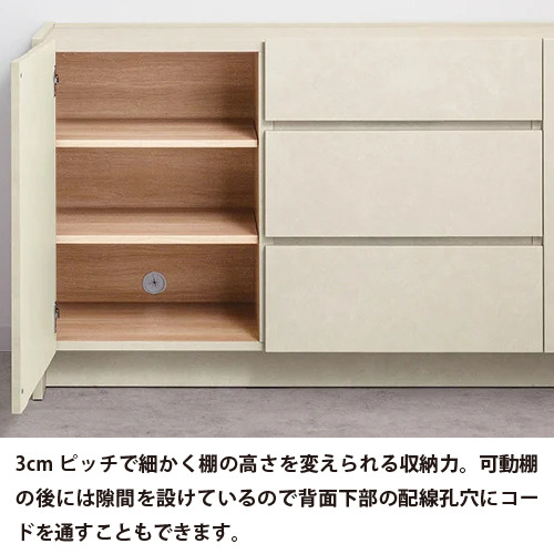 3cmピッチで細かく棚の高さを変えられる収納力。可動棚の後には隙間を設けているので背面下部の配線孔穴にコードを通すこともできます。
