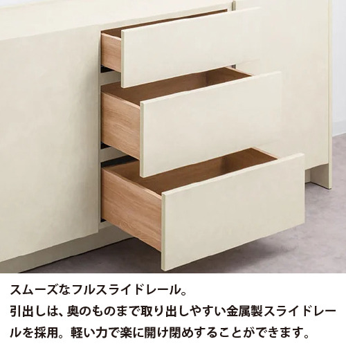 引出しは、奥のものまで取り出しやすい金属製スライドレールを採用。軽い力で楽に開け閉めすることができます。