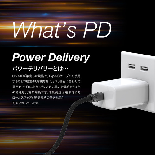 パワーデリバリーとはUSB-IFが設定した規格で、Type-Cケーブルを使用する事で通常のUSB充電に比べ高速での充電が可能です。