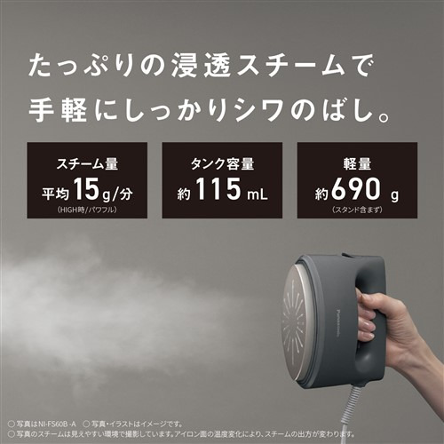 ●パワフルな浸透スチームで、シワのばしも脱臭(※脱臭効果(当社調べ) 【試験対象】生乾き臭・ペット臭・加齢臭(ノネナール)・汗臭・タバコ臭・飲食臭(焼肉・焼き魚) 【試験方法】ニオイをつけたウールの生地に約10秒間パワフルスチームをあて、脱臭効果を6段階臭気強度法にて評価 【試験結果】対象臭気それぞれにおいて、有意な臭気抑制効果を確認 【試験対象】防虫剤臭(樟脳) 【試験方法】ニオイをつけたウールの生地に約10秒間パワフルスチームをあて、脱臭効果をガスクロマトグラフィー質量分析法にて評価 【試験結果】対象臭気において、有意な臭気抑制効果を確認※)・除菌(※除菌試験内容 【試験依頼先】(一財)日本食品分析センター 【試験成績書発行番号】第16107291001-0101号、第16107291001-0201号、第21129635001-0101号 【試験方法】菌付着布にアイロン面を押しあてて1秒間パワフルスチームをあてた場合とアイロン面を1 cm浮かせて5秒間パワフルスチームをあてた場合の除菌確認 【試験結果】99 %の除菌効果(試験は2種類の菌で実施)※)も。