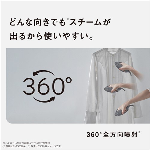 スチームが360°どの方向に傾けてもたっぷり噴射(※ハンガーにかけた衣類に平行に向けた場合※)するから、丈の長い衣類でも使いやすい。さらに、約19秒で立ち上がるから時間のない時でもサッとかけられる。