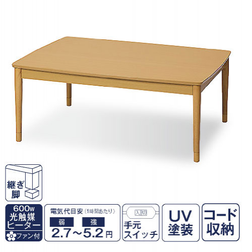 [長方形105×75] YKF15Aヒカリ 光触媒こたつ オリジナルコタツ ナチュラル 丸脚 600Wヒーターファン 手元スイッチ