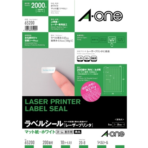 エーワン 65200 ラベルシール[レーザープリンタ] マット紙 四辺余白付 角丸 A4サイズ 10シート(2000片)入り
