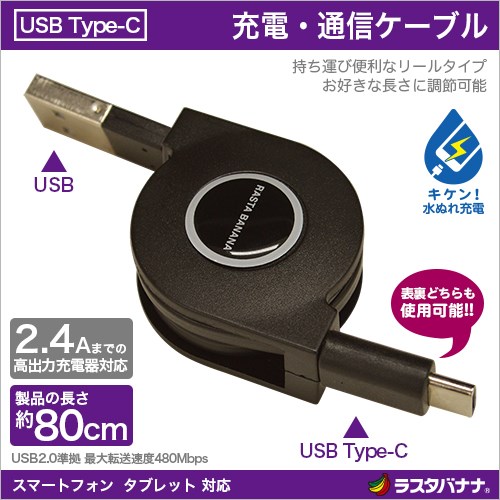 RASTA BANANA(ラスタバナナ) RBHE250 Type-C USB 通信・充電 ケーブル リールタイプ 高出力充電器対応 ブラック