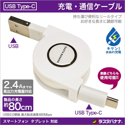 RASTA BANANA(ラスタバナナ) RBHE251 Type-C USB 通信・充電 ケーブル リールタイプ 高出力充電器対応 ホワイト