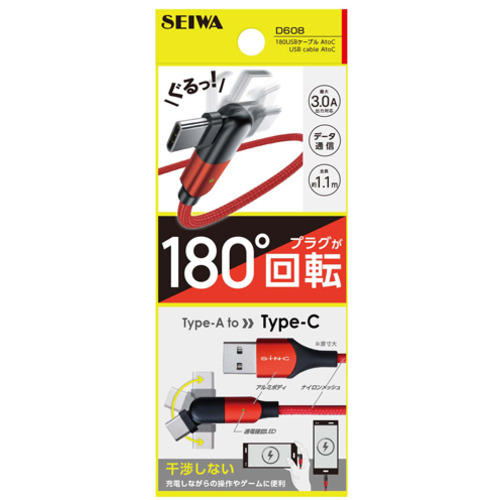 セイワ D608 180°ワンエイティUSBケーブル AtoC 1m レッド