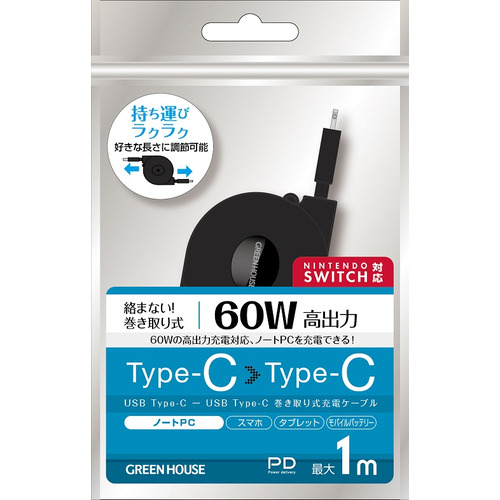 グリーンハウス GH-UMCA60-BK USB2.0 60W 巻き取りUSB充電ケーブル 1.0m ブラック GHUMCA60BK