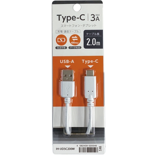 オズマ IH-UD3C200W Type-C端子ケーブル USB-Aモデル200cm ホワイト