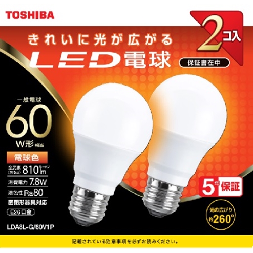 【推奨品】東芝 LDA8L-G/60V1P LED電球 全方向 電球色 60W形相当 2個入り